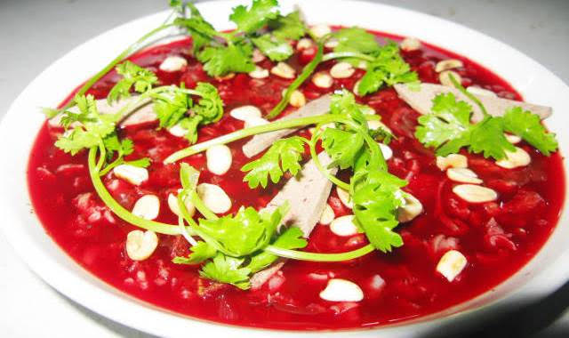 Agar tambah lezat dan membangkitkan aroma, makanan yang diartikan sebagai “salad darah sapi” ini biasanya ditambahkan sejumlah daun mint.