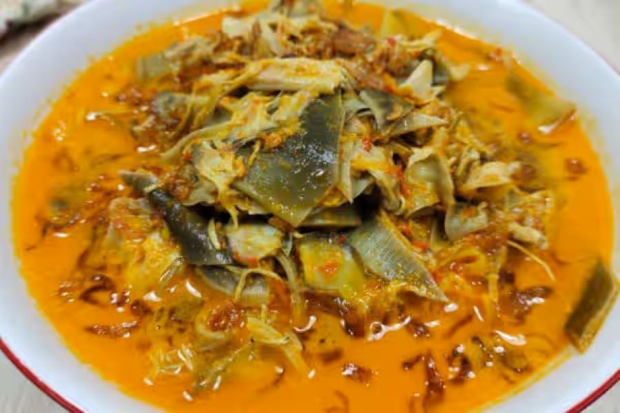 - Masukkan santan, masak hingga bumbu merata dan kuah menyusut. Tambahkan jantung pisang, masak sebentar, angkat.
