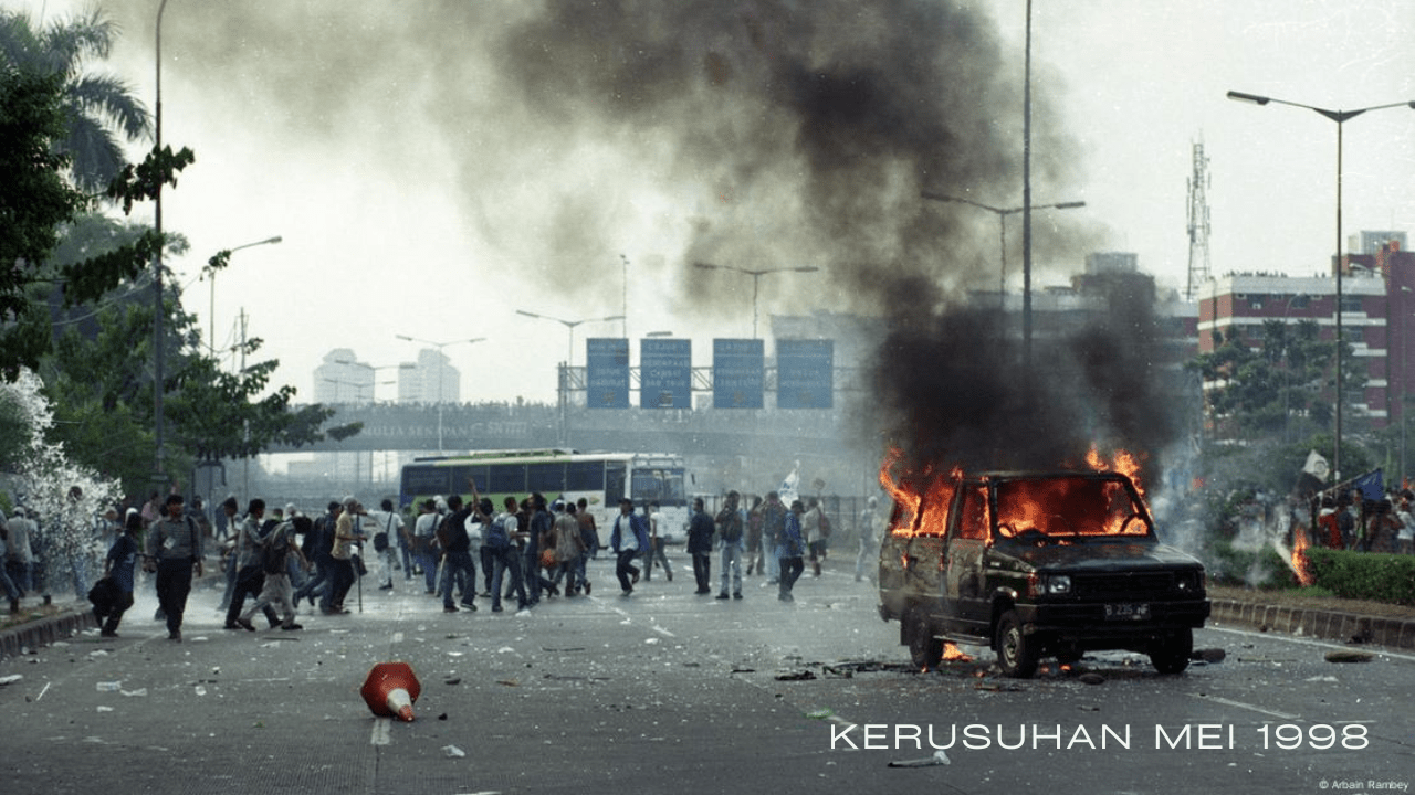 Di Jakarta dan banyak kota besar lainnya di Indonesia terjadi kerusuhan besar tak terkendali mengakibatkan ribuan gedung, toko maupun rumah di kota-kota Indonesia hancur lebur dirusak dan dibakar massa. Ribuan perusuh menjarah mal, membakar pabrik, mobil, rumah, toko-toko etnis Tionghoa, dan melakukan pelecehan seksual. Kekerasan seksual terhadap perempuan Tionghoa menjadi puncak kekejaman, dengan korban dilecehkan, disekap, bahkan dibunuh secara biadab.